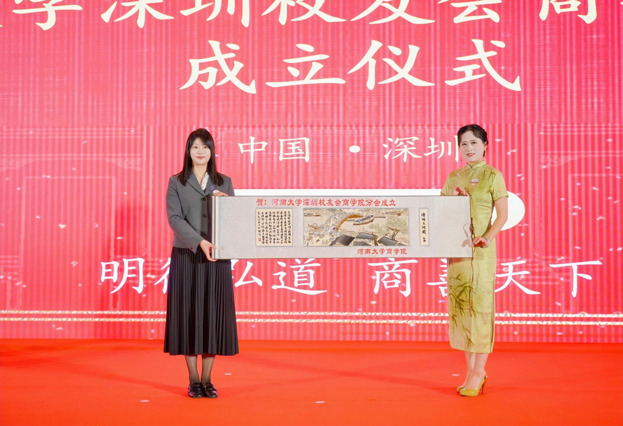 刘婷和新葡萄官网AMG学生工作负责人马欢欢分别代表新葡萄官网AMG校友总会和新葡萄官网AMG向新葡萄官网AMG分会赠送贺礼。象征着吉祥和喜庆的纪念品,不仅是对新葡萄官网AMG分会成立的祝贺,更表达了母校对校友们的深情厚谊和美好祝愿。