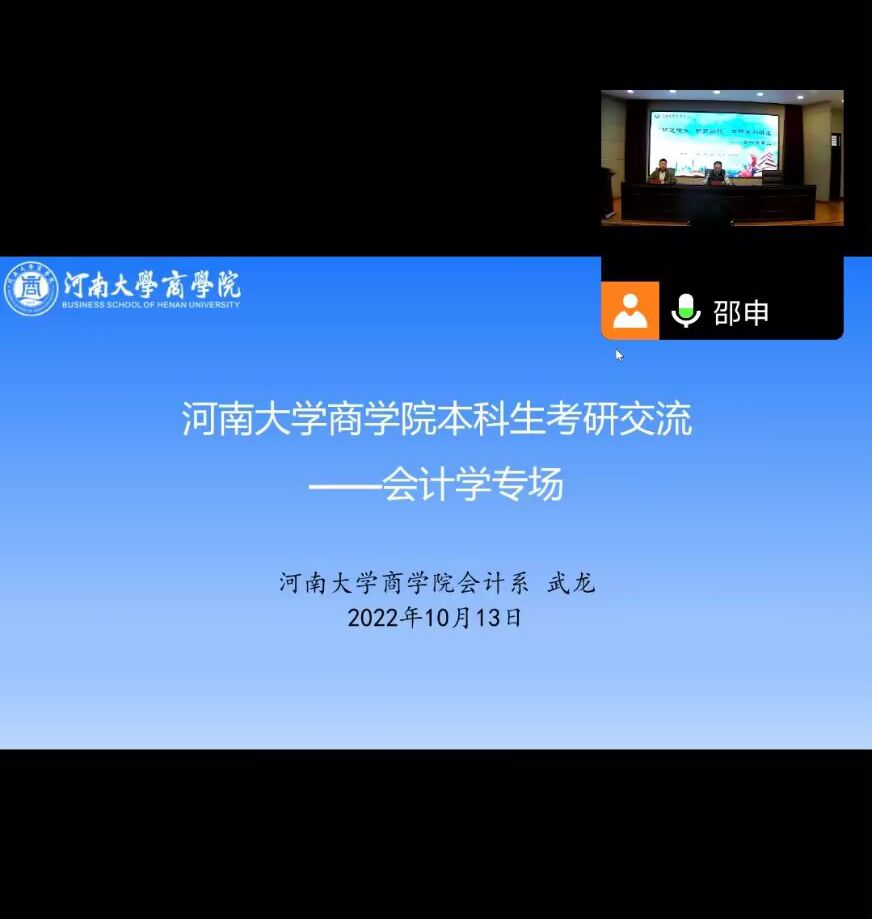 10月13日下午,新葡萄官网AMG“研途相伴,助梦启航”考研系列讲座--会计学专业在二楼报告厅举行,本次讲座采用线上方式进行,由会计系教授、博士生导师武龙主讲,团委负责人郑林浩主持。