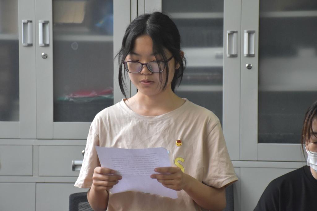 老团员代表谢清荟发言,在对新团员们表示热烈祝贺的同时,她指出,身为共青团员,要时刻牢记自己的责任,努力完成团组织交给的各项任务,在学习、生活等各项活动中起模范带头作用,爱校爱团,使自己无愧于“团员”这个光荣的称号。