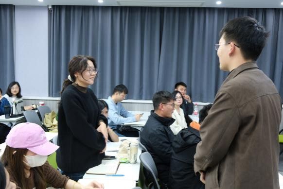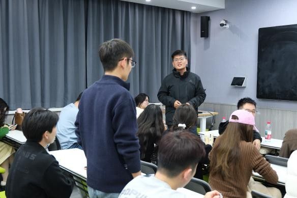 交流会在王武煜同学简洁有力的开场白中拉开帷幕。他首先介绍了本次交流会的背景与目的,随后引导全场进入经验分享环节。五位2024级优秀学生代表结合自身经历,分别从学业规划、论文写作、行业求职、学科竞赛及职业资格证书等角度展开深入分享。崔颖同学以《学业规划与高分攻略》为题,系统介绍了核心课程的学习方法、小组作业的协作技巧,以及如何与任课老师进行有效沟通。杨壮同学在《学术论文发表全指引》中,系统介绍了论文写作的基本流程、选题技巧、期刊选择与文献检索工具的使用,并分享了与导师合作发表论文的实践经验。