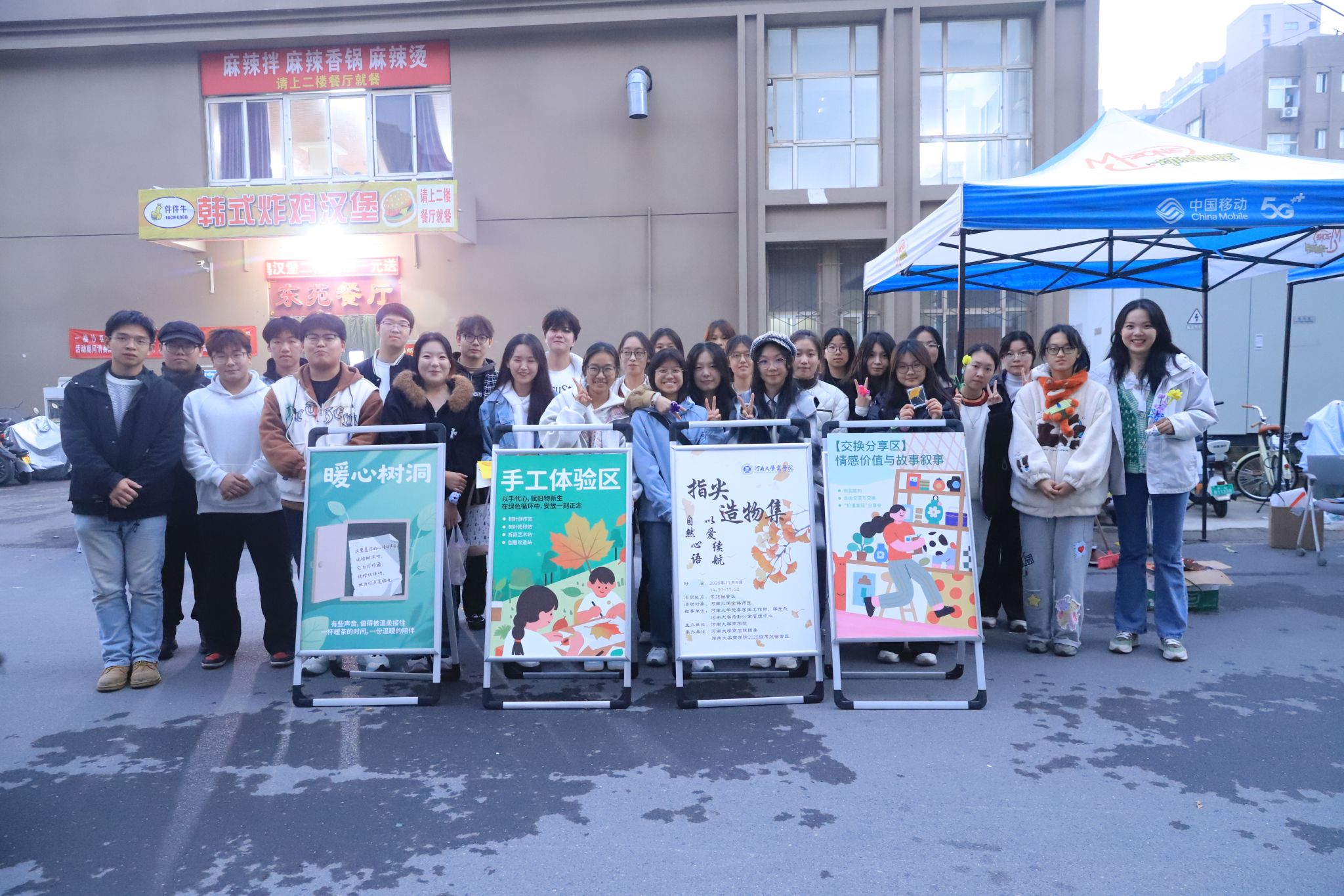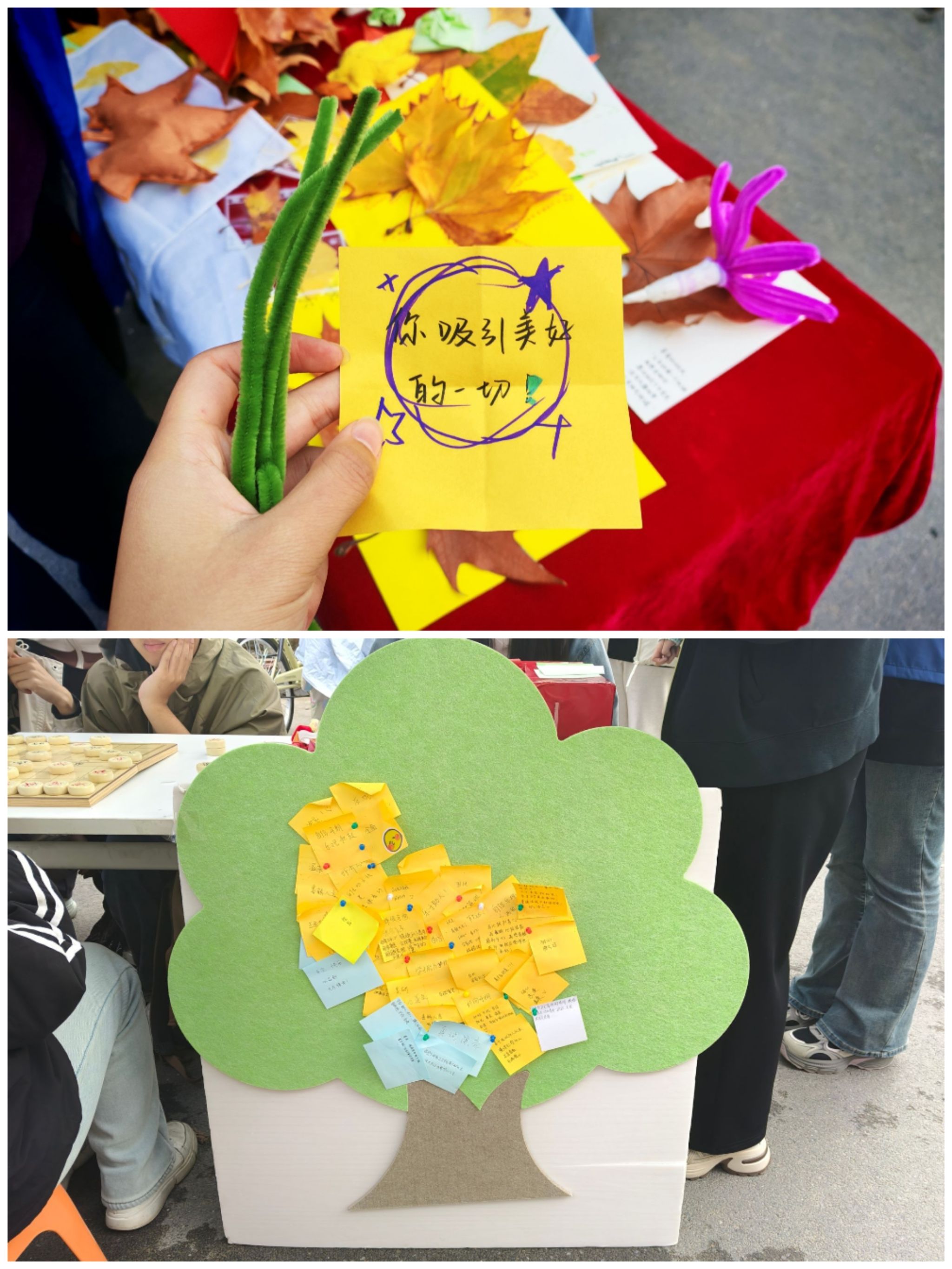 活动设置了三个互动区域。手工体验区以绿色循环和正念创作为核心,学生通过树叶拼贴、拓印、折纸等方式,在动手过程中了解环保理念;心情互动区设有“暖心树洞”寄语箱和“成长伙伴”倾听岗,为学生提供情感表达和心理陪伴的渠道;交换分享区组织学生进行闲置物品交换,并开展“价值发现”分享会,让学生在交流中分享物品背后的故事。活动尾声的“暖心礼遇”环节,工作人员为参与师生发放“爱的传递”小礼物,同时组织“祝福漂流帖”传递活动。2025级会计学(大数据会计)专业杨茜同学称,收到礼物和祝福帖后很温暖,现在宿舍区不仅是住宿的地方,还能参与活动、收获关怀,越来越像“第二个家”。